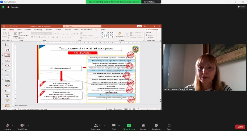 Освітньо-професійна програма, яка реалізується в нашому університеті, є унікальною та має ряд переваг, що забезпечує потужну підготовку бакалаврів з харчових технологій. У своїй доповіді Оксана Кочубей-Литвиненко наголосила, що підготовку здобувачів вищої освіти здійснюють викладачі дев’яти технологічних кафедр, що дає можливість майбутнім фахівцям опанувати усі харчові технології, які реалізуються в Україні. Потужний колектив викладачів постійно працює над підвищенням рівня якості освіти.