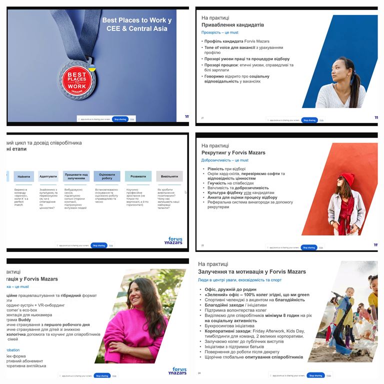 Вона поділилася особливостями реалізації цих процесів у Mazars. Зокрема, процес приваблення кандидатів включає: визначення профілю кандидата, формування tone of voice для вакансій із урахуванням цього профілю, забезпечення прозорих умов праці та процедури відбору, дотримання етичних норм, справедливого рівня оплати та соціальної відповідальності у вакансіях.