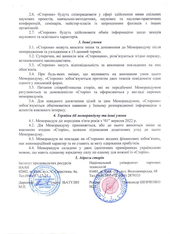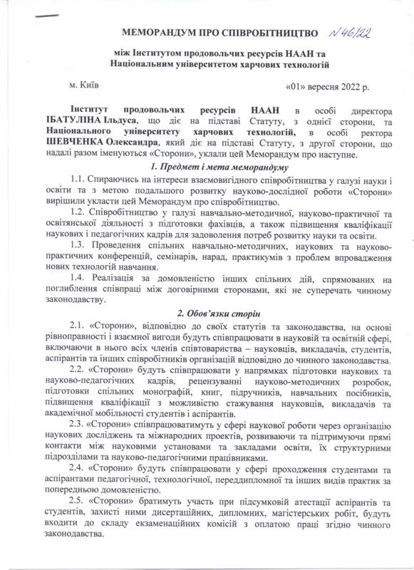 Попри нелегкі реалії сьогодення наш університет продовжує розширювати співпрацю з науковими установами України й зарубіжжя. Зокрема за ініціативи ректора Олександра Шевченка та директора Інституту продовольчих ресурсів НААН Ільдуса Ібатулліна укладено Меморандум про співробітництво у галузі науки і освіти між академічними науковими спільнотами наших закладів.