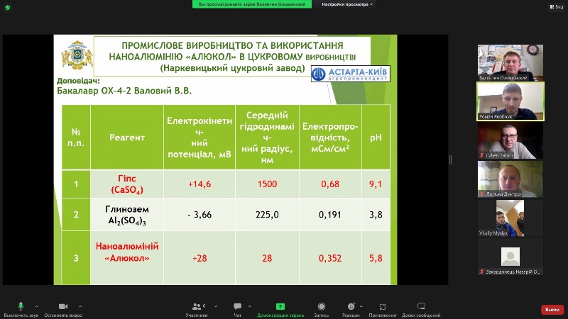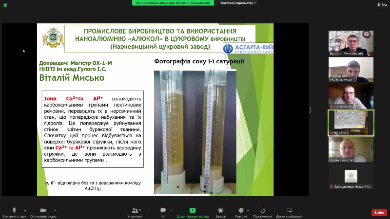 Учасники гуртка, бакалаври групи ОХ-3-2 Назар Закордонець, групи ОХ-4-2 Володимир Валовий, магістр групи ОХ-1-3М Віталій Мисько та керівники гуртка у режимі онлайн обговорили результати досліджень наукового етапу «Аналіз існуючих способів вилучення сахарози з бурякової стружки з використанням додаткових реагентів». До обговорення результатів наукових пошуків здобувачів долучилися доценти кафедри Роман Якобчук і Дмитро Люлька.