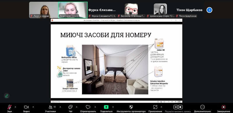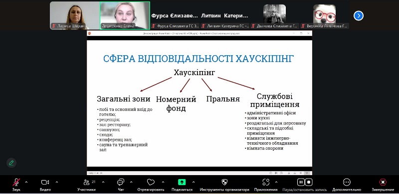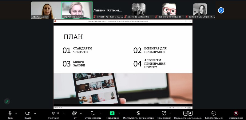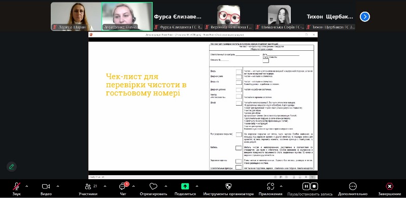 Фахівчиня акцентувала увагу на дотриманні стандартів чистоти та гігієни як основі успішної діяльності підприємств гостинності. Лекторка розповіла про принципи організації прибирання та сферу відповідальності служби хаускіпінгу в готелі, зокрема види і послідовність прибиральних робіт, кольорове кодування інвентарю та витратних матеріалів, використання професійних мийних і дезинфікуючих засобів, вимоги до пакувальних матеріалів і санітарного стану виробничих приміщень, чек-лист перевірки чистоти приміщень. Окрему увагу приділила питанню особистої гігієни персоналу, проведенню медичних оглядів і догляду за спецодягом.