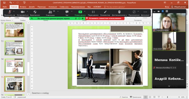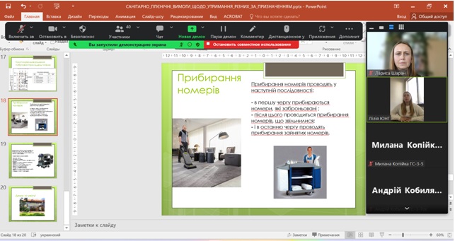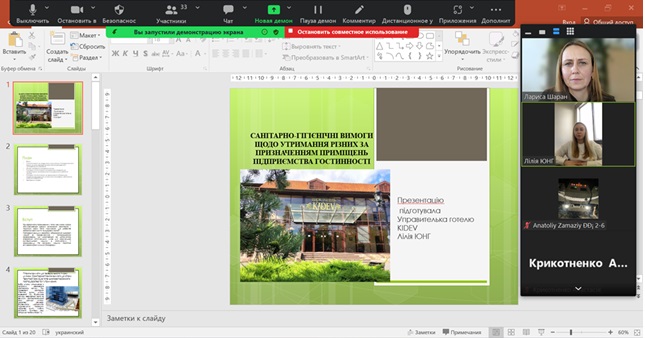 Фахівчиня зосередила увагу на ключових моментах дотримання санітарно-гігієнічних вимог на підприємствах гостинності, як запоруці успіху готельно-ресторанного бізнесу, зокрема на використанні закладом безпечних матеріалів і поверхонь, що контактують з харчовими продуктами; безпечних пакувальних матеріалах; програмі миття, очищення, прибирання та дезінфекції виробничих приміщень, інвентарю та обладнання; кольоровому кодуванню інвентарю; правилах поведінки персоналу, відвідувачів виробничих приміщень; періодичності проходження медоглядів персоналу; вимогах до спецодягу та догляду за ним; умовах зберігання та температурних режимах для різних груп сировини та харчової продукції; правилі FIFO/ FEFO; умовах транспортування харчової продукції і т.п.