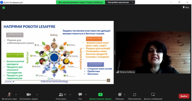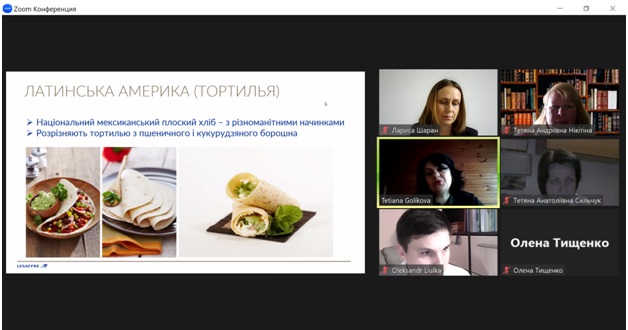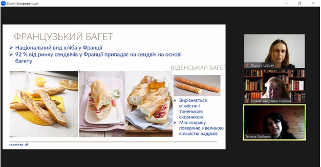 Черговий науковий семінар на кафедрі готельно-ресторанної справи. Доповідачка – технологиня ТОВ «Лесаффр Україна», кандидатка технічних наук Тетяна Голікова з доповіддю «Вироби для сендвічів: секрети успіху». Аудиторія в онлайні – викладачі кафедри, здобувачі освітніх ступенів бакалавра і магістра спеціальності 241 «Готельно-ресторанна справа».