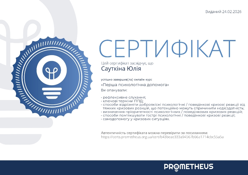 Здобувачки освітньо-професійної програми «Менеджмент персоналу» 2-3 курсів Інна Остапець, Юлія Сауткіна, Вікторія Приходько, Світлана Даценко долучилися до навчання на онлайн-платформі Prometheus. У межах дисциплін психологічного спрямування вони успішно завершили професійний курс «Перша психологічна допомога» й отримали іменні сертифікати.
