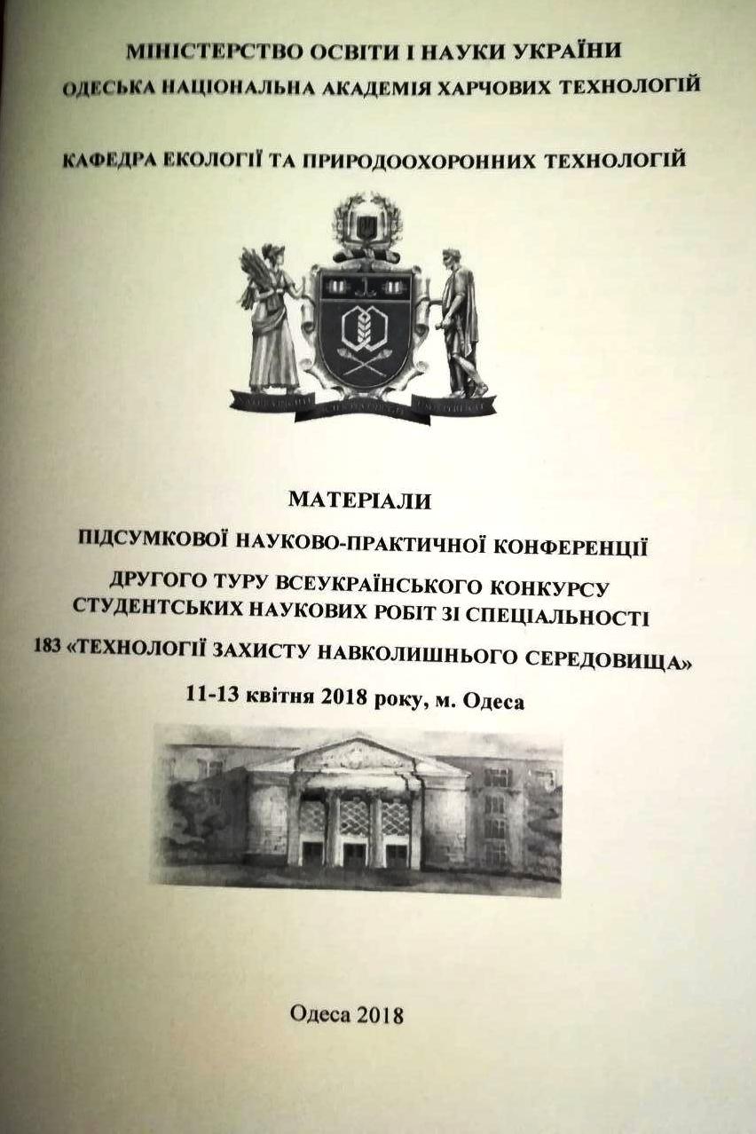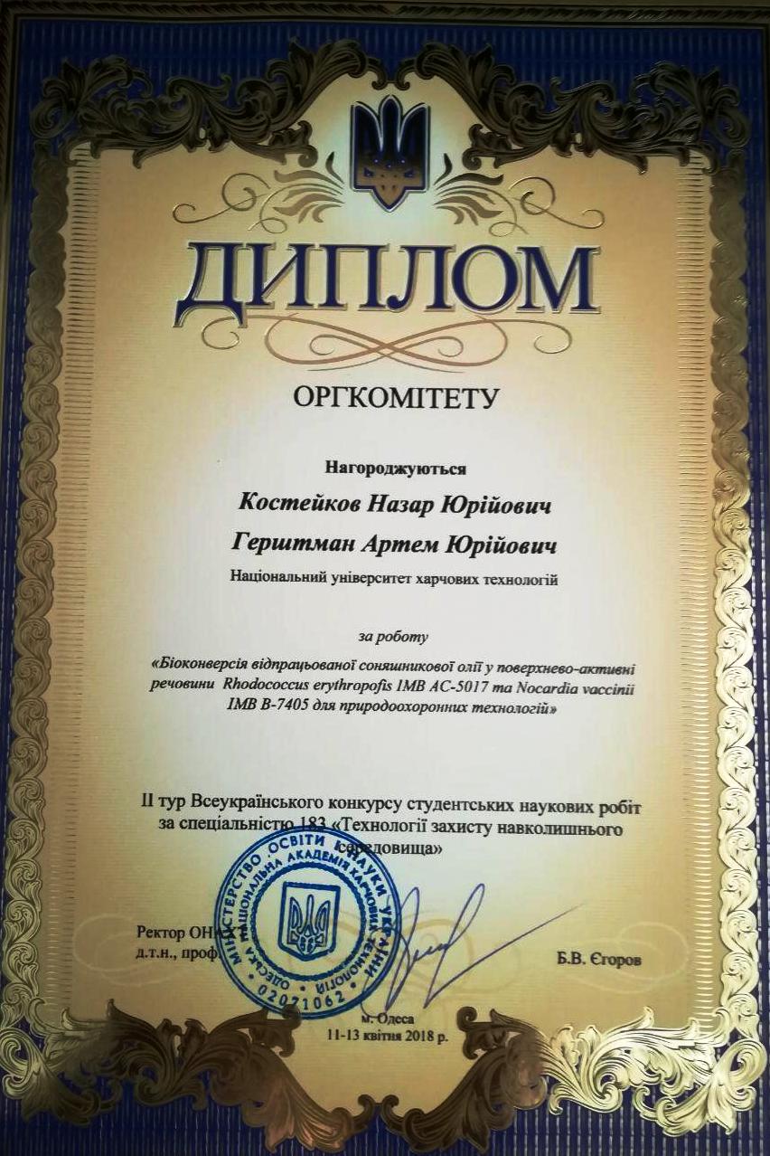 11-13 квітня в Одесі відбулася підсумкова науково-практична конференція ІІ туру Всеукраїнського конкурсу студентських наукових робіт зі спеціальності «Технології захисту навколишнього середовища». Слід наголосити, що конкурс за даною спеціальністю відбувався вперше, і кафедра біотехнології і мікробіології НУХТ не могла залишитись осторонь цієї події. Відповідальна місія представляти наш університет випала магістрантам І року навчання Назару Костейкову та Артему Герштману. Наші студенти представляли наукову роботу «Біоконверсія відпрацьованої соняшникової олії у поверхнево-активні речовини Rhodococcus erythropolis IMB AC-5017 та Nocardia vaccinii IMB B-7405 для природоохоронних технологій», що була реалізована під керівництвом завідувача кафедри, д.б.н., професора Тетяни Пирог.