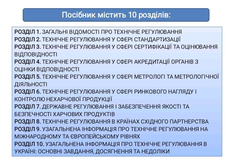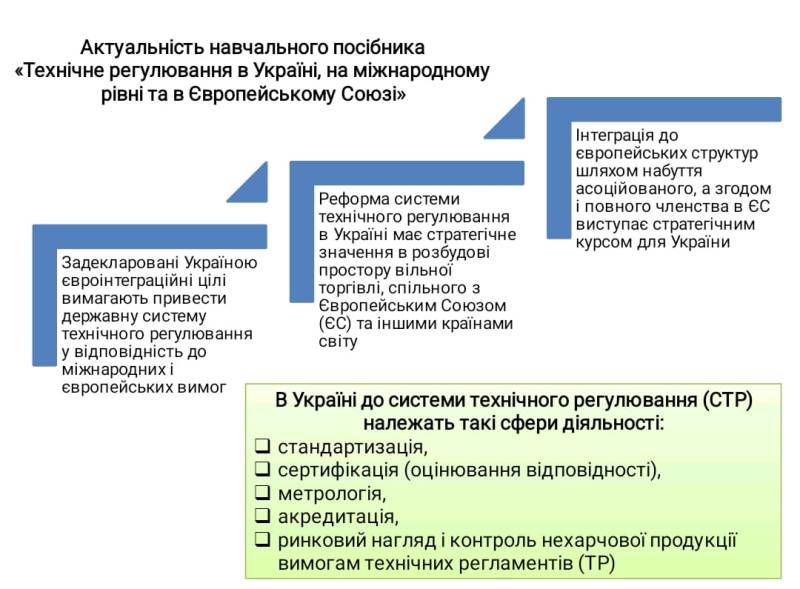 У навчальному посібнику висвітлені основні положення законодавчих, нормативно-правових актів, нормативних документів у сферах діяльності, що входять до системи технічного регулювання України (стандартизації, сертифікації, оцінювання відповідності, метрології, акредитації, ринкового нагляду і контролю). Приведені етапи створення й удосконалення цих сфер, вимоги СОТ і законодавства ЄС щодо недопущення технічних бар’єрів у торгівлі, що створюються в цих сферах, аналіз дотримання вимог і правил СОТ та європейського законодавства в українських законодавчих та інших документах.