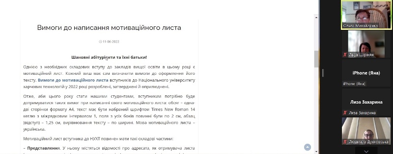 Також у ході тренінгів поговорили про складання мотиваційного листа, який цього року є однією з необхідних складових вступу до закладів вищої освіти на всі освітні ступені й усі форми навчання. Майбутні вступники до магістратури дізналися, що вимоги до мотиваційного листа вступників до Національного університету харчових технологій у 2022 році розроблені, затверджені й оприлюднені.
