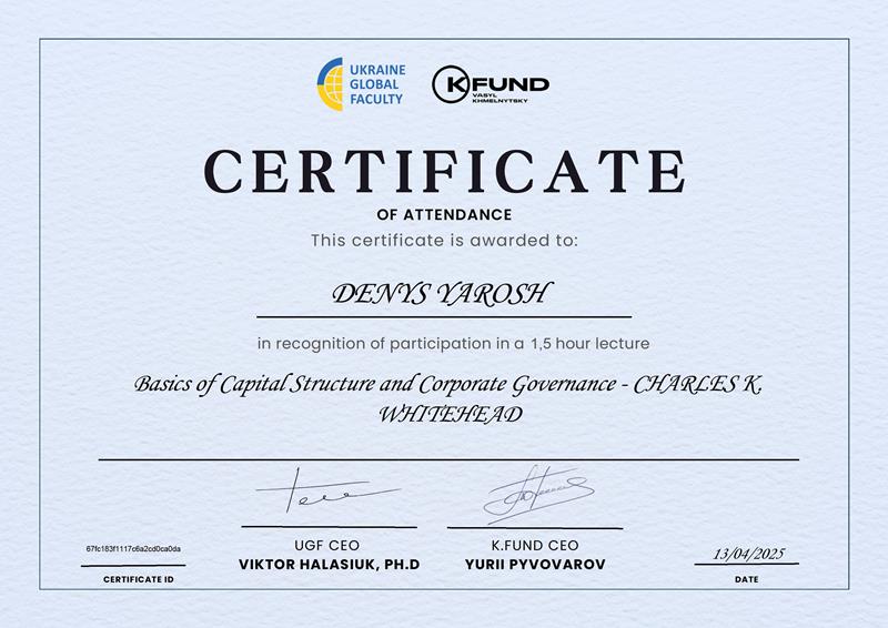 – «Basics of Capital Structure and Corporate Governance» (Charles K. Whitehead) – ключові принципи структури капіталу, фінансової політики компаній і корпоративного управління.
