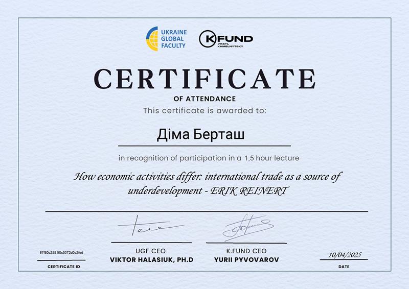 У рамках цієї ініціативи здобувачі освіти беруть участь у міжнародних сертифікатних курсах через освітню платформу Ukraine Global Faculty за підтримки Міністерства освіти і науки України. Платформа дає доступ до відеолекцій від провідних науковців і практиків зі світових університетів і компаній.