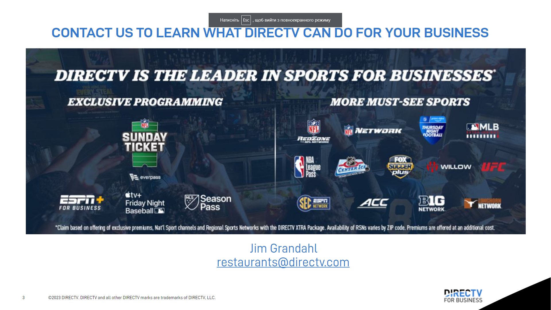 15 листопада 2023 р. команда DIRECTV National Accounts у партнерстві з National Restaurant Association з метою підтримки ресторанного бізнесу, залучення та розширення можливостей просування закладів ресторанного господарства, а також надання персоналізованих послуг преміального розважального продукту, провели вебінар «Заповніть свій заклад і збільште дохід за допомогою спортивних програм від DIRECTV для бізнесу» («Fill Your Establishment and Increase Revenue with Sports Programming from DIRECTV for BUSINESS»). Спікер – Джим Грандал (DIRECTV National Accounts).