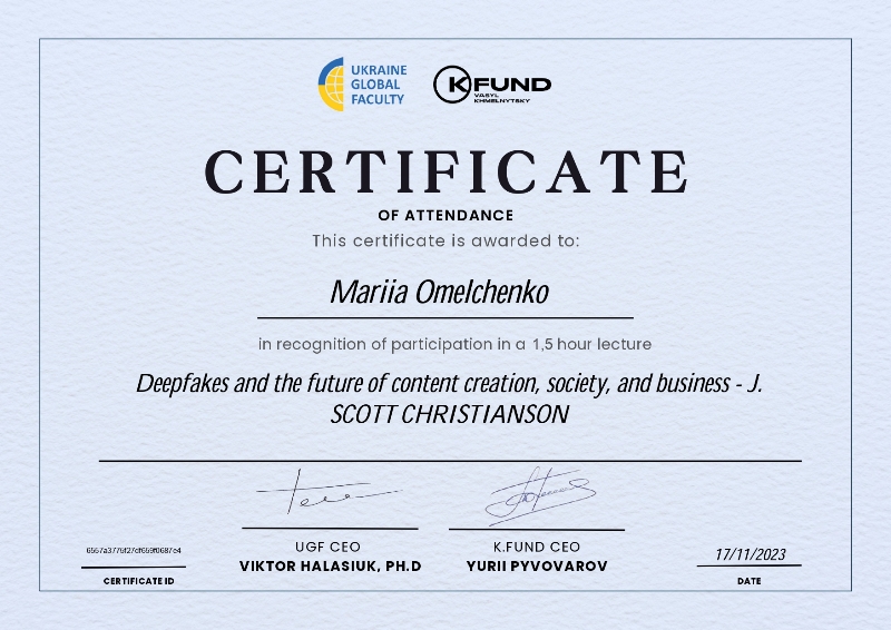 17 листопада здобувачі-бакалаври освітньо-професійної програми «Технології харчування» та магістранти освітньо-професійної програми «Технології в ресторанному господарстві», а також викладачі кафедри технології ресторанної і аюрведичної продукції прослухали онлайн-лекцію «Deepfakes і майбутнє створення контенту, суспільства та бізнесу», яку прочитав директор Центру підприємництва та інновацій Бізнес-коледжу Труласке Університету Міссурі Дж. Скотт Крістіансон.