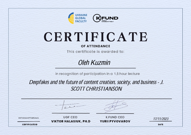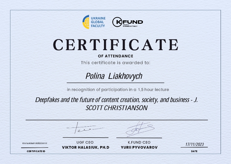 Діпфе́йк – методика синтезу зображення людини, яка базується на штучному інтелекті. Її використовують для поєднання і накладання одних зображень та відео на інші зображення або відеоролики. Поява глибокого фейкового контенту відіграватиме важливу роль у суспільній довірі та тому, як ми працюватимемо в онлайн-світі. Лектор виділив плюси та мінуси цієї нової технології. Також говорили, як ми можемо розпізнати діпфейки та що можемо зробити, щоб захистити себе від оманливих діпфейків.
