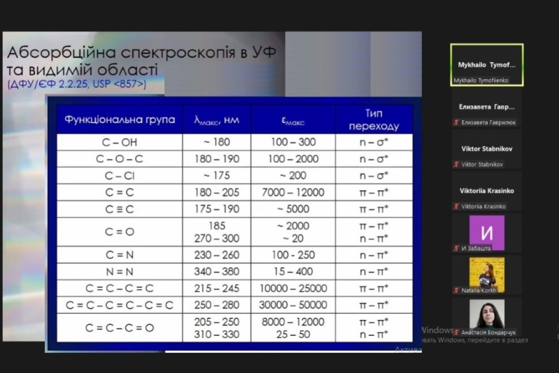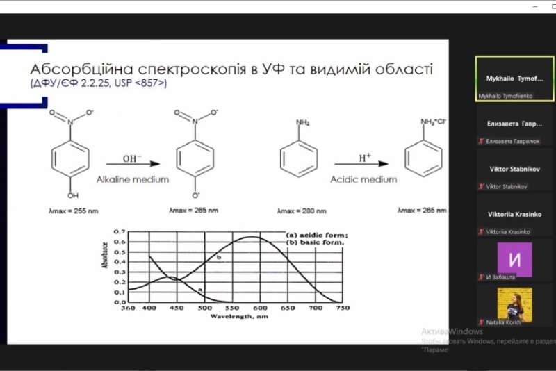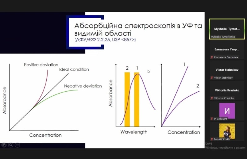 Фахівець нагадав, що таке спектроскопія та які методи є найбільш використовувані. Розповів про абсорбційну спектроскопію в ультрафіолетовій і видимій області. Більшість спектроскопічних методик для субстанцій – це ідентифікація діючої речовини у готовому лікарському засобі; ідентифікація барвників, а для кількісного визначення діючих речовин вона використовується рідше. Ультрафіолетову спектроскопію використовують під час аналізу сумарних препаратів. Це препарати рослинного походження для яких не визначають конкретну, одну діючу речовину, а суму діючих речовин як клас, наприклад поліфеноли, флавоноїди.