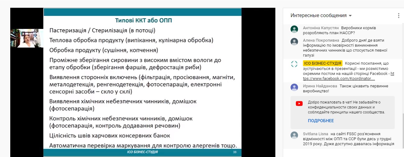 Лектор роз’яснила терміни; ознайомила з принципом НАССР №2 «Визначення ККТ»; вказала на основні помилки при підготовці до аналізування небезпечних чинників і при його проведенні; навела класифікацію за категоріями ризику та визначення заходів (у рамках програм-передумов) і заходів керування (план НАССР, операційна програма передумова (ОПП), які повинні бути реалізовані; поділилася практичним досвідом при створенні Методології «Вибирання та ранжування заходів керування»; надала приклади форм ОПП і плану НАССР, типових ККТ та ОПП, а також відповіла на питання «Критична межа чи критерій дії? Що вибрати?», «Як встановити систему моніторингу в ККТ та для ОПП?». Дуже корисними для слухачів стали лайфхаки з практичного досвіду лектора.
