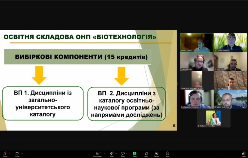 Здобувачі освітньо-наукового ступеня «доктор філософії» першого року навчання зустрілися з гаранткою освітньо-наукової програми (ОНП) «Біотехнологія» спеціальності 162 «Біотехнології та біоінженерія», професоркою Тетяною Пирог. До зустрічі також доєднались деканка факультету біотехнології та екологічного контролю Наталія Грегірчак, завідувач кафедри біотехнології і мікробіології Віктор Стабніков і доцентка Оксана Скроцька, які є членами робочої групи з розроблення ОНП «Біотехнологія».