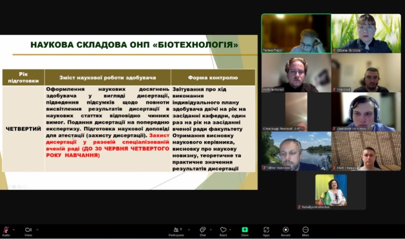 Тетяна Пирог пояснила, як відбувається затвердження теми дослідження та індивідуального плану роботи, наголосила на необхідності звітування про хід виконання індивідуального плану двічі на рік на засіданні кафедри та один раз на рік на засіданні вченої ради факультету. За три роки навчання здобувачі ступеня «доктор філософії» мають підготувати та опублікувати не менше трьох статей у фахових наукових виданнях (щороку здобувач має підготувати до публікації щонайменше одну статтю). Протягом четвертого року навчання здобувачі оформлюють отримані експериментальні наукові результати у вигляді дисертаційної роботи, підводять підсумки щодо повноти висвітлення результатів дисертації в наукових статтях відповідно до чинних вимог. Після проведення попередньої експертизи дисертації здобувачі презентують основні її положення на науковому семінарі кафедри. При виконанні усіх чинних вимог відбувається захист дисертації у разовій спеціалізованій вченій раді.