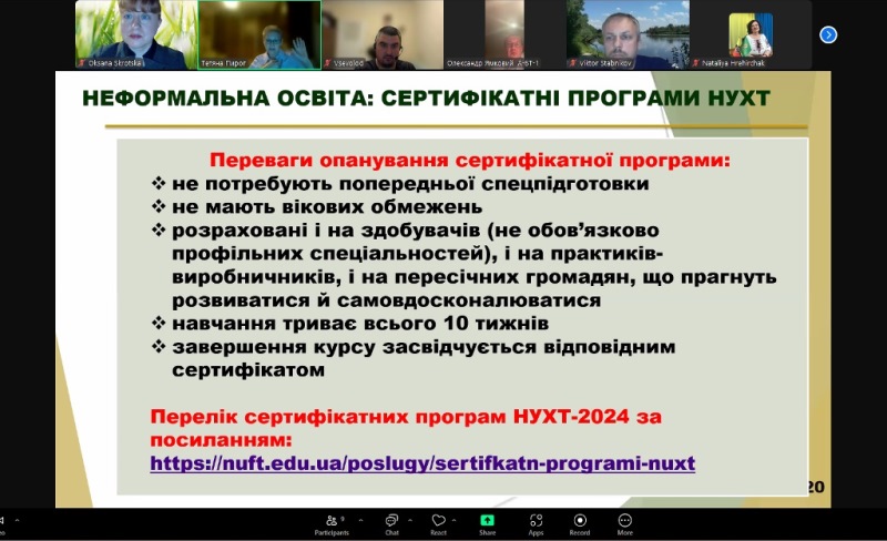 Далі присутні ознайомилися з можливостями неформальної освіти та сертифікатними програмами НУХТ. Отримані результати навчання неформальної освіти визнаються в системі формальної освіти в порядку визначеному законодавством, а процедури їх визнання описуються Положеннями НУХТ.