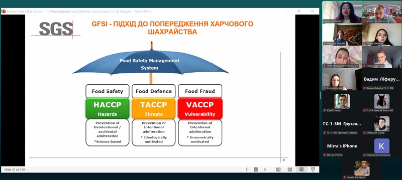 Спікерка обговорила з магістрантами практики Food Defence і Food Fraud, інструменти оцінювання вразливостей і загроз (VACCP/TACCP), типові ризики та алгоритми реагування для готельних підприємств і закладів ресторанного господарства. Студенти отримали корисні практичні рекомендації зі створення та впровадження управлінських інновацій у сфері якості послуг і безпечності харчової продукції у господарську діяльність суб’єктів готельного та ресторанного бізнесу.