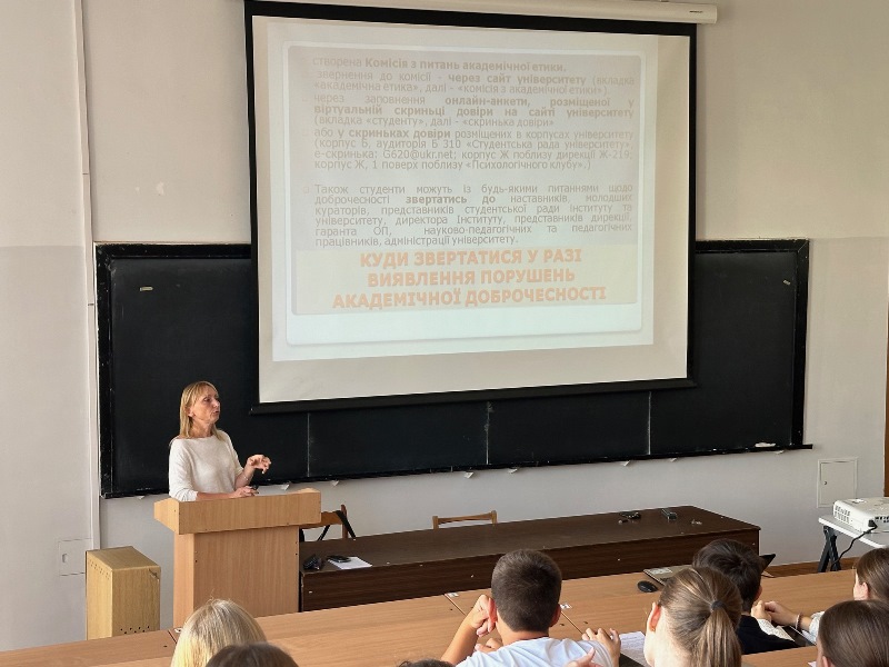 Гарантки освітніх програм Оксана Кочубей-Литвиненко і Оксана Петруша розтлумачили першачкам важливі питання академічної етики, академічної культури і, власне, академічної доброчесності; дали їм зрозуміти, що Кодекс академічної етики, який діє в НУХТ, передусім, захищає їхні права від недоброчесної поведінки з боку інших учасників освітнього процесу. Цьогоріч особливий акцент був зроблений на унормованій у НУХТ політиці використання штучного інтелекту, який дедалі більше входить у наше повсякденне життя і не оминає освітній процес.