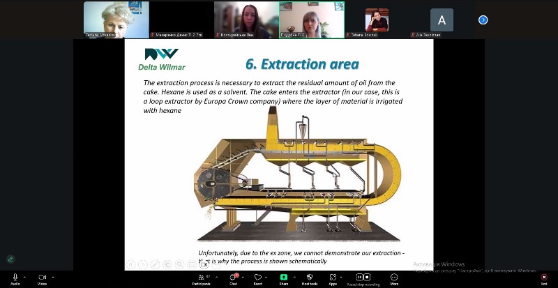 Лекторка пояснила здобувачам мету екстрагування олії з олійного матеріалу, конструктивні особливості петлеподібного екстрактора CROWN, переваги та небезпеки, пов’язані з використанням гексану на виробництві, розповіла про методи контролю якості екстракційної олії та шроту. Також продемонструвала відео з олійно-екстракційного цеху, навела цікаві практичні кейси щодо роботи цеху.