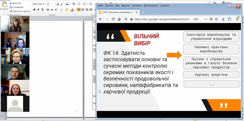 На кафедрі експертизи харчових продуктів відбулося засідання робочої групи у складі гаранток освітньо-професійних програм на освітніх рівнях «бакалавр» і «магістр» Світлани Усатюк та Лариси Арсеньєвої, викладачок кафедри Оксани Вашеки, Вікторії Кійко і Оксани Петруші, практиків – провідної фахівчині відділу контролю якості виробництва Департаменту якості ТОВ «СІЛЬПО-ФУД» Олени Самойлової та провідного аудитора ТОВ «Бюро Верітас Сертифікейшн Україна» Сергія Плічка, а також здобувачки вищої освіти НУХТ, студентки групи ХЕ-2-7 Дарини Бондаренко.