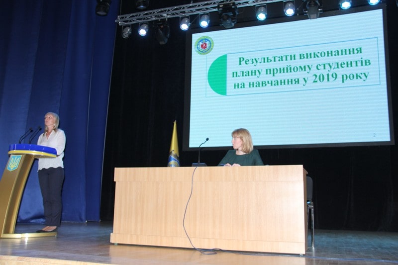 Щодо підсумків роботи інституту за минулий навчальний рік і планів на поточний навчальний рік і перспективу доповідала директор інституту Оксана Кочубей-Литвиненко. Вона детально проаналізувала результати виконання плану прийому студентів у 2019 році, зупинилася на питаннях комплектування контингенту студентів, навчально-методичній і науковій роботі. Очільник підрозділу говорила про дуальну освіту, що в минулому навчальному році вже була успішно впроваджена кількома кафедрами, про якісне оновлення змісту дисциплін й інноваційні підходи до методики викладання, акцентувала увагу на необхідності виконання плану видавничої діяльності, закликала активно долучатися до профорієнтаційної роботи.