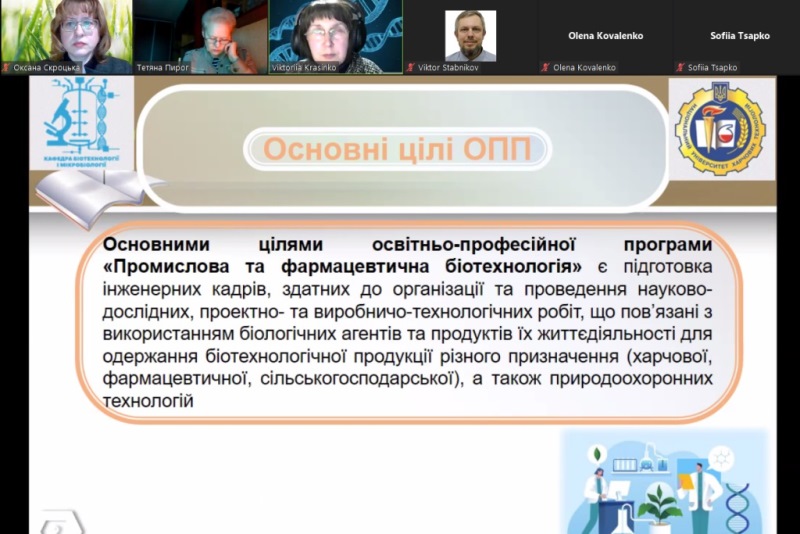 2 лютого 2024 року відбулася онлайн-зустріч розширеної робочої групи освітньо-професійної програми (ОПП) «Промислова та фармацевтична біотехнологія» підготовки здобувачів освітнього ступеня «магістр» спеціальності 162 «Біотехнології та біоінженерія», у якій взяли участь викладачі, задіяні у створенні та реалізації програми – д.т.н., професор Віктор Стабніков, д.б.н., професорка Тетяна Пирог, д.б.н., доцентка Людмила Буценко, к.б.н., доцентка Оксана Скроцька, к.т.н., доцентка Вікторія Красінько та деканка факультету біотехнології та екологічного контролю, к.т.н., доцентка Наталія Грегірчак, а також магістранти денної та заочної форм навчання – першого курсу Анастасія Охмакевич, Ростислав Коваль, Ірина Пальона, Єва Фофанова та другого курсу Юлія Іванченко і Юліана Забродська. Особливо приємною була участь у зустрічі випускників кафедри, а нині фахівців-стейкхолдерів: провідної біотехнологині відділу інактивованих ембріональних вакцин ТОВ «Біотестлаб» Олени Коваленко, старшої інженерки з управління ланцюгами постачання сектору кваліфікації постачальників відділу аудитів Департаменту управління якістю АТ «Фармак» Софії Цапко та фахівця з мікробіологічного контролю Дніпровського крохмалепатокового заводу Євгена Омельчука, які є представниками промислового, фармацевтичного та харчового (у поєднані з природоохоронним) секторів біотехнологічного ринку.
