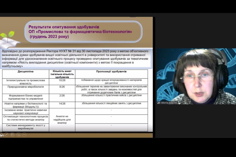 Темою зустрічі стало обговорення результатів моніторингу ОПП за 2023 рік, оцінювання сильних і слабких сторін програми та окреслення шляхів її поліпшення на 2024 рік. Доцентка Вікторія Красінько, яка є гаранткою програми, доповіла про якість освітньої діяльності, висвітливши унікальність програми, відповідність її цілей місії та візії НУХТ, відповідність загальних і фахових компетентностей, програмних результатів навчання вимогам Стандарту вищої освіти підготовки магістрів за спеціальністю 162 «Біотехнології та біоінженерія».