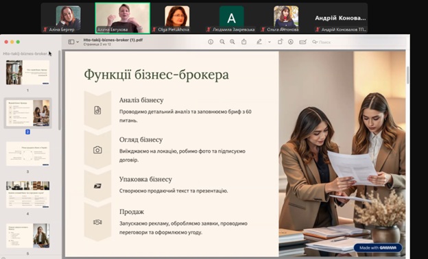 Лекторка поділилася цінною інформацією про особливості професії бізнес-брокера, нюанси купівлі-продажу бізнесу, а також реальними кейсами з практики.