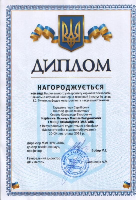 Команда Навчально-наукового інженерно-технічного інституту ім. акад І.С. Гулого НУХТ традиційно, в десятий раз, взяла участь у цій олімпіаді. Цього року команда була представлена студентами Іваном Глущенком, Даніїлом Філозофом, Олександром Семеною, Денисом Шмагайло і Валентиною Гущик. Керівник команди - професор кафедри мехатроніки та пакувальної техніки Микола Якимчук.