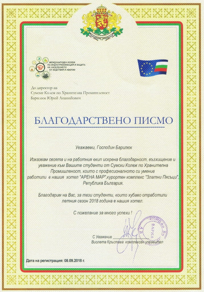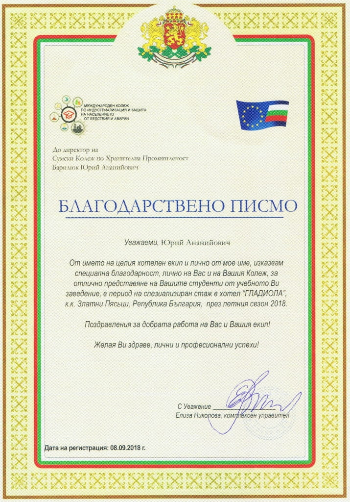 Петро Сиротін вручив листи подяки адміністрації Сумського коледжу харчової промисловості НУХТ від представників готелів курортного комплексу «Золоті Піски». Адміністрація готелів «АРЕНА МАР» та «ГЛАДИОЛА» відзначила високу професійну підготовку наших студентів.