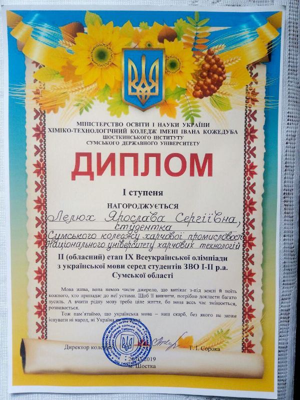 21 березня 2019 року на базі Хіміко-технологічного коледжу ім. І.М. Кожедуба СумДУ відбувся ІІ обласний етап ІХ Всеукраїнської олімпіади з української мови серед студентів ЗВО І-ІІ рівня акредитації, у якому студентка групи 2-ХП-08 Сумського коледжу харчової промисловості НУХТ Ярослава Лелюх виборола І місце і представлятиме Сумську область на завершальному етапі в м. Вінниця