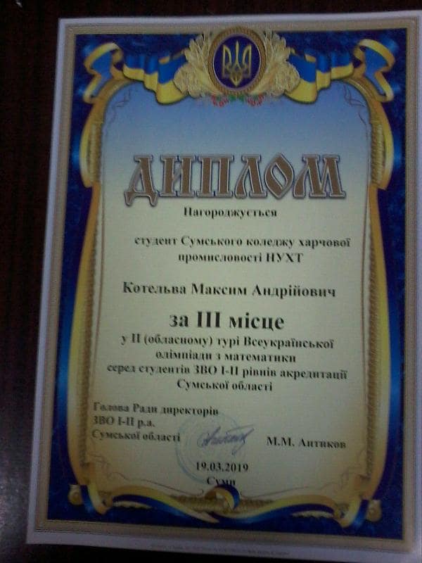 На базі машинобудівного коледжу СумДУ відбувся II тур олімпіади з математики серед студентів першого курсу ВНЗ I - II рівнів акредитації. Студент нашого коледжу Максим Котельва, який навчається на технічному відділенні в групі 1-Е-30, посів III місце.