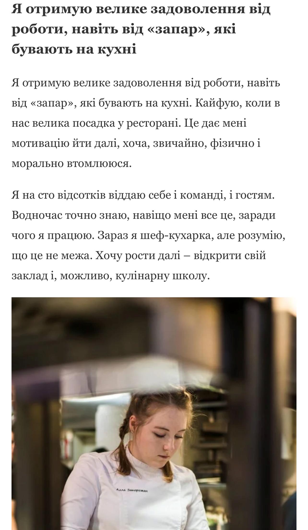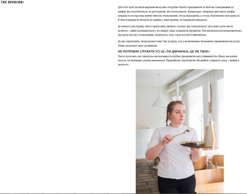 Про стереотипи щодо жінок на кухні ресторану з незалежним жіночим виданням www.thedevochki.com поділилася магістрантка факультету готельно-ресторанного та туристичного бізнесу Алла Запорожан, яка успішно поєднує навчання з роботою за фахом.