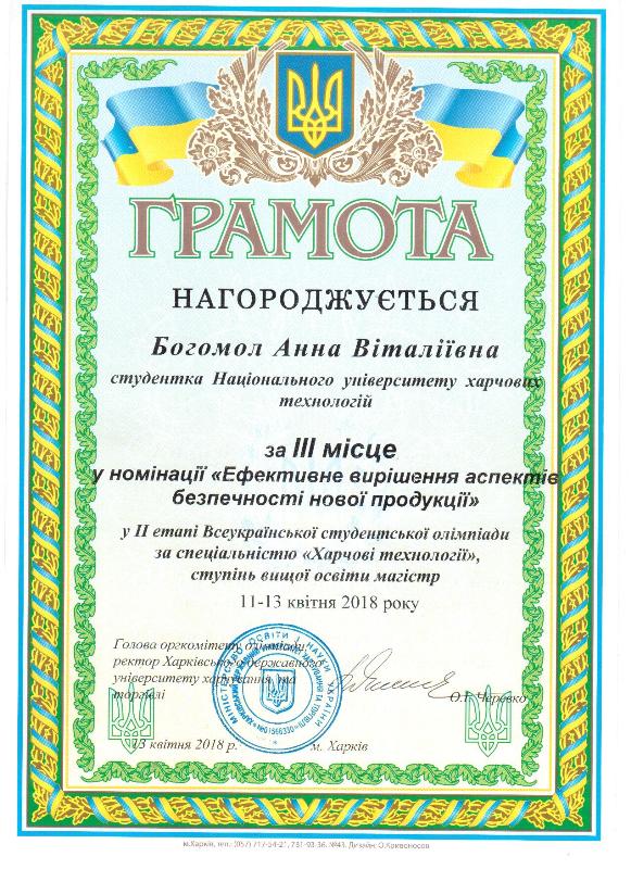 На базі Харківського державного університету харчування та торгівлі відбувся ІІ етап Всеукраїнської студентської олімпіади за спеціальністю 181 «Харчові технології», де наш університет представили студенти І курсу освітнього ступеню «Магістр» факультету готельно-ресторанного та туристичного бізнесу Леся Волинська та Анна Богомол.