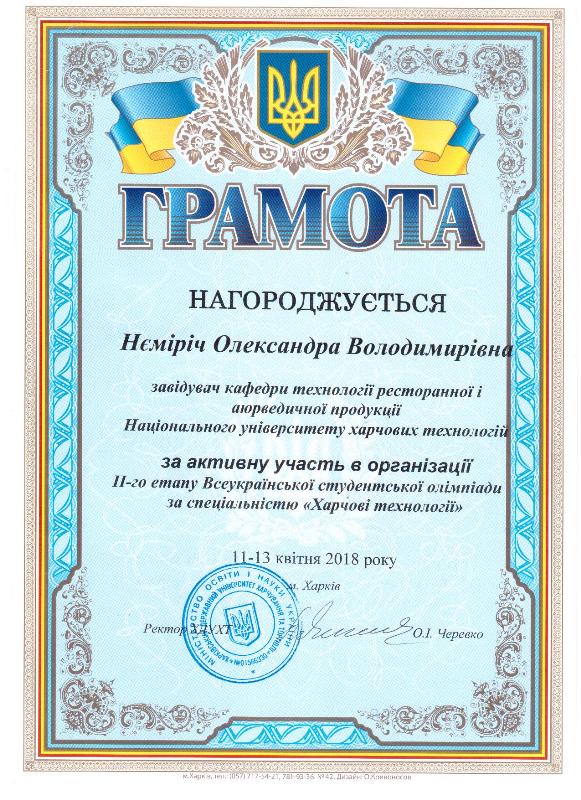 За активну участь в організації ІІ-го етапу Всеукраїнської студентської олімпіади грамотою відзначена завідувач кафедри технології ресторанної і аюрведичної продукції Олександра Нєміріч.