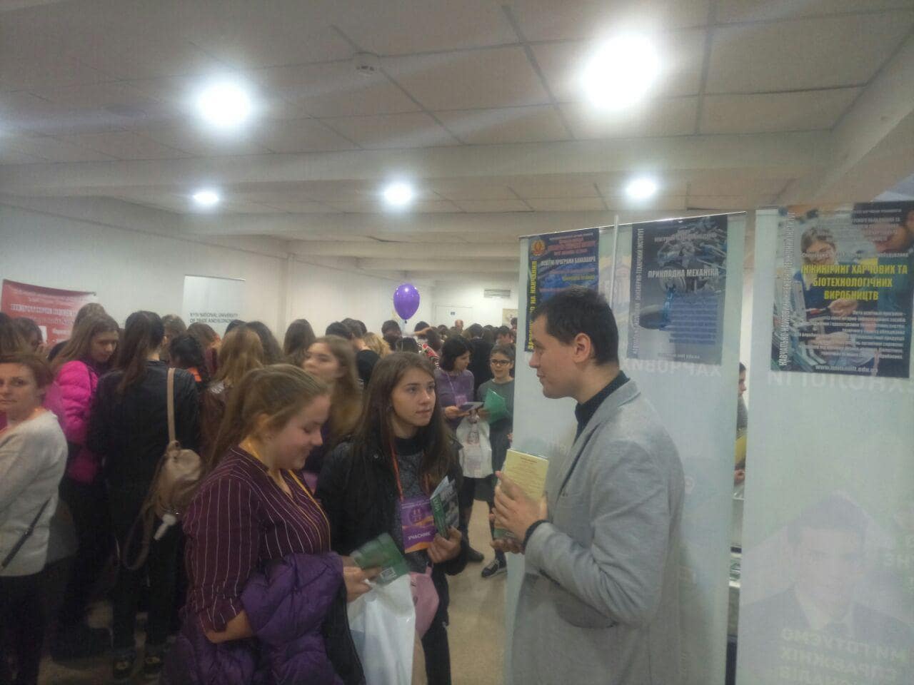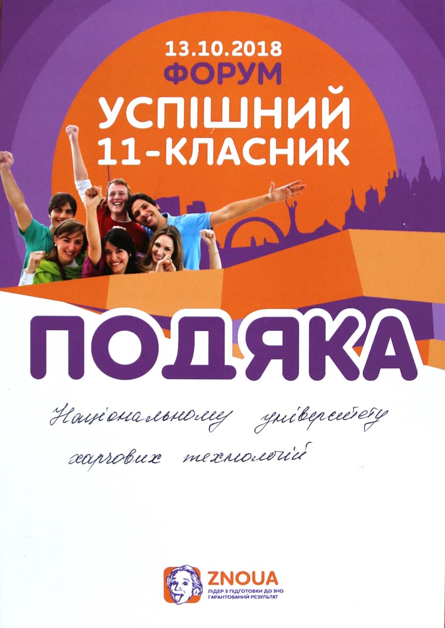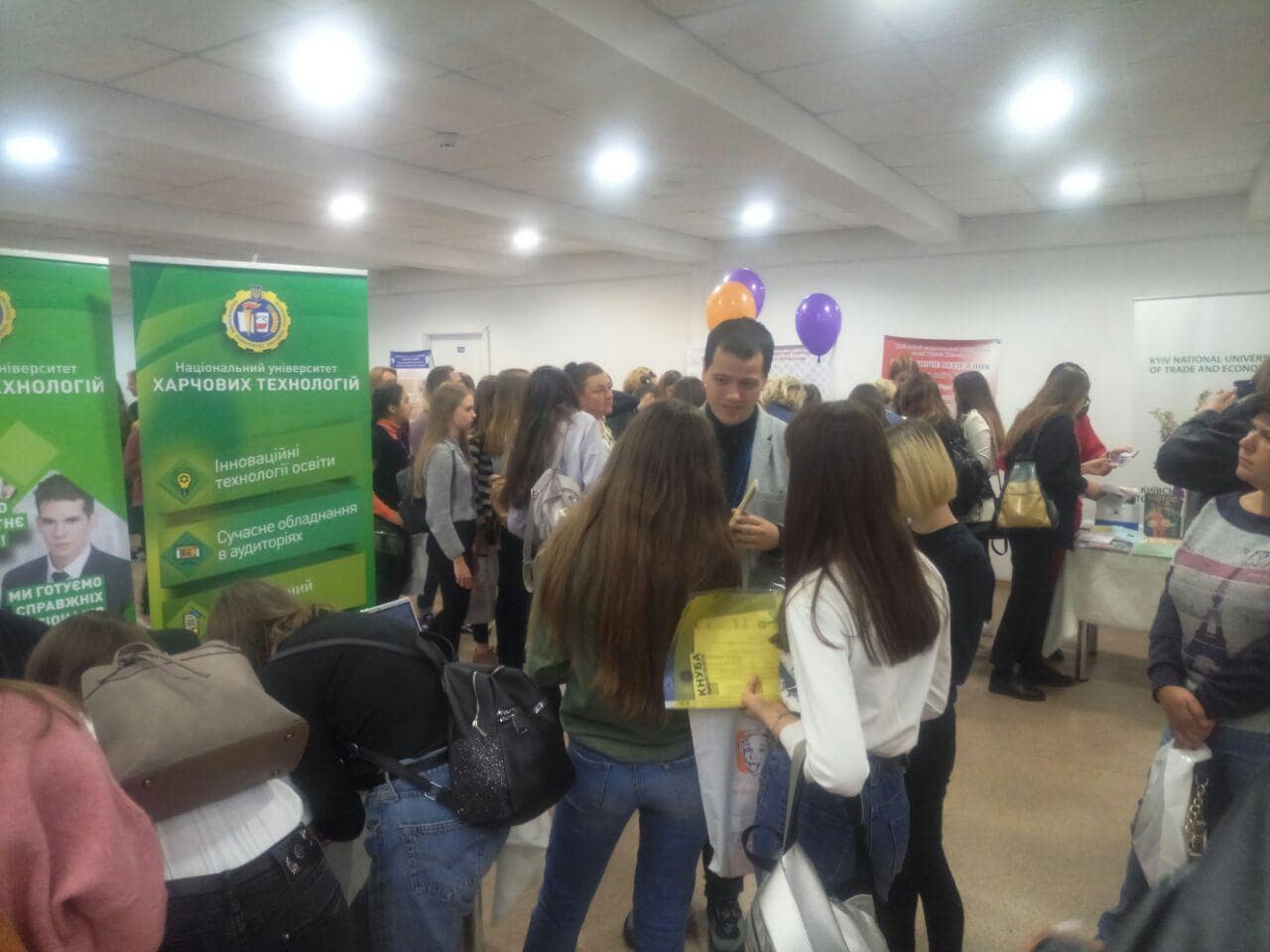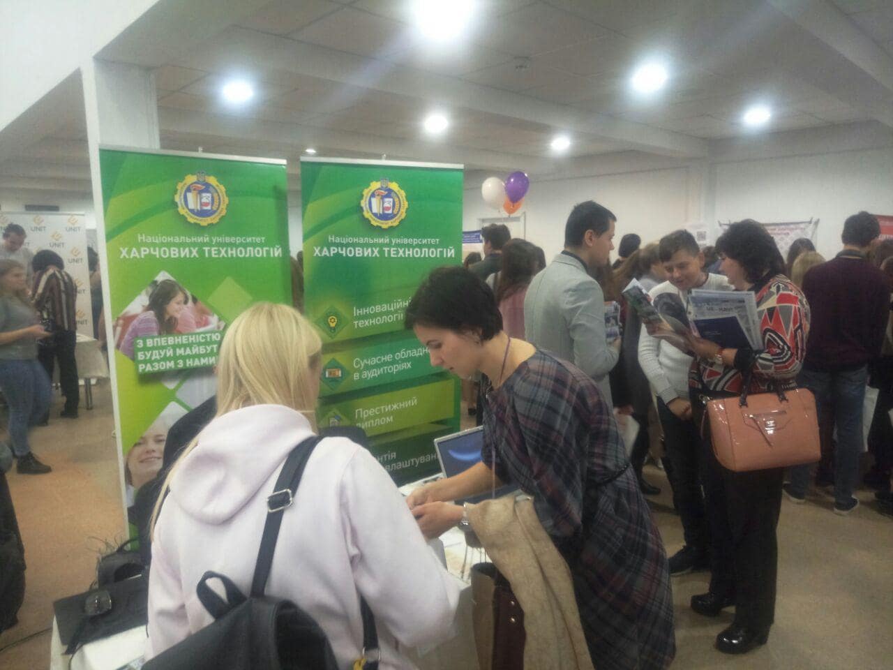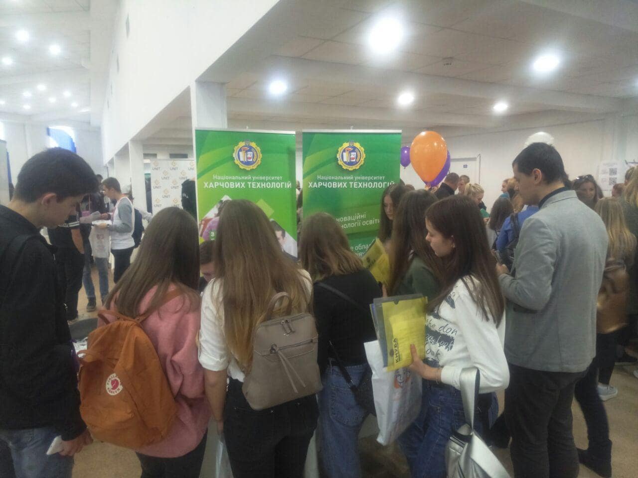 Наш університет представляли активісти студентської ради і, зокрема студенти Навчально-наукового інженерно-технічного інституту ім. акад. І.С. Гулого Андрій Задніпряний, Борис Михайлик і факультету біотехнології та екологічного контролю Марія Козловські й Ігор Нікітенко. До студентства приєднався викладач кафедри машин і апаратів харчових та фармацевтичних виробництв Віталій Рачок. Від них школярі отримали ґрунтовну інформацію щодо спеціальностей і освітніх програм, за якими здійснюється підготовка фахівців у нашому університеті, умов вступу і навчання, широких можливостей, що відкриваються перед нашими студентами – займатися науковими дослідженнями, реалізувати свої творчі, спортивні, громадські здібності, долучатися до благодійних заходів тощо. Дізналися вони також про підготовку до здачі ЗНО та вступу до університету, яка здійснюється на нашому підготовчому відділенні, про додаткові бали, що їх можуть отримати випускники наших підготовчих курсів при вступі до університету, а також переможці Всеукраїнських олімпіад НУХТ. Усі бажаючі отримали рекламно-інформаційні матеріали про НУХТ і вичерпні відповіді на всі свої питання. Тепер майбутні вступники мають необхідну інформацію, щоб не розгубитися у вирі освітніх пропозицій і зробити по-справжньому зважений вибір своєї майбутньої професії. А організатори заходу - освітня компанія ZNOUA відзначили участь нашої команди подякою.