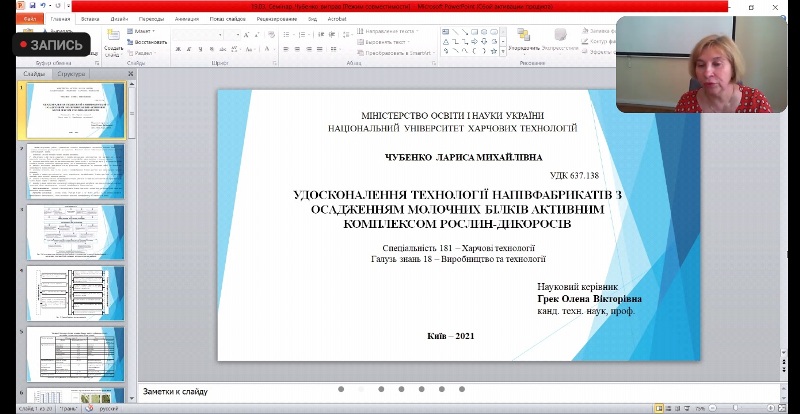 16 червня 2021 року на засіданні разової спеціалізованої вченої ради ДФ 26.058.008 аспірантка кафедри технології молока і молочних продуктів Лариса Чубенко презентувала свої дослідження за темою «Удосконалення технології напівфабрикатів з осадженням молочних білків активним комплексом рослин-дикоросів». Наукова керівниця – кандидатка технічних наук, професорка кафедри Олена Грек.