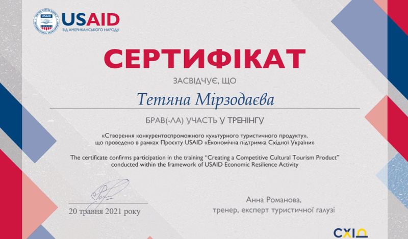 Наприкінці травня доцентка кафедри туристичного та готельного бізнесу Тетяна Мірзодаєва пройшла онлайн-тренінг зі створення культурного туристичного продукту для представників громадських організацій, місцевої влади та бізнесу, які зацікавлені у розвитку туризму в Приазов’ї. Захід відбувся за сприяння Проєкту USAID «Економічна підтримка Східної України».