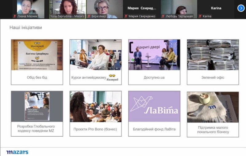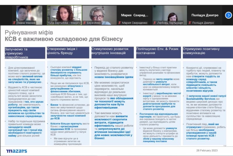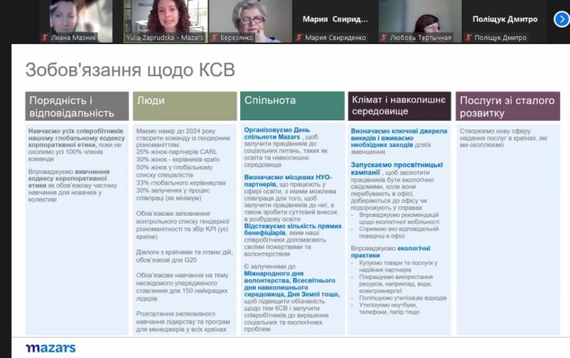 Спікерка детально охарактеризувала напрямки забезпечення активності та залученості співробітників, а також позицію компанії Mazars як відповідального роботодавця, що піклується не тільки про бізнес, а й про суспільство, навколишнє середовище, майбутнє.
