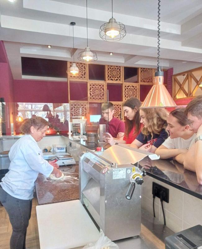 На наших майбутніх бакалаврів з готельно-ресторанної справи очікувало знайомство з особливостями організації роботи усіх структурних підрозділів закладів із сучасним устаткуванням, а також майстер-клас із приготування хачапурі, хінкалі та кави.
