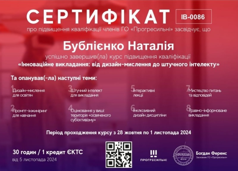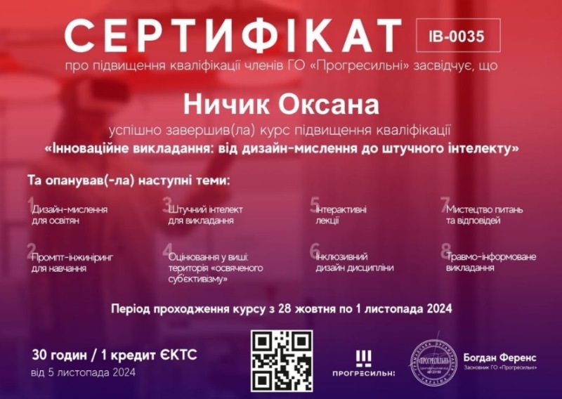 Доцентки кафедри екології та екоменеджменту Оксана Ничик, Наталія Бублієнко та Ольга Тогачинська взяли участь у підвищенні кваліфікації на тему «Інноваційне викладання: від дизайн-мислення до штучного інтелекту» від ГО «Прогресильні» – знаного в Україні об'єднання освітян, студентів і публічних управлінців.