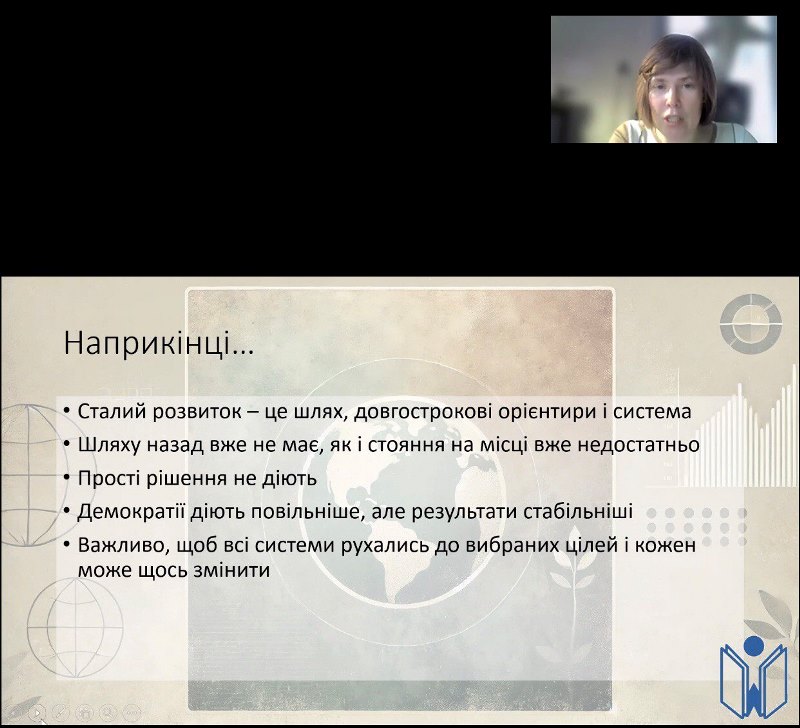 Спікерка детально розглянула важливість демократичного устрою, принципів народовладдя та того, як ці аспекти пов’язані зі сталим розвитком. Вона підкреслила, що для досягнення цілей сталого розвитку необхідна співпраця країн, незалежно від їх політичних систем. Особливу увагу було приділено аналізу цілей сталого розвитку як результату взаємодії демократичних і диктаторських режимів. Зустріч стала важливою платформою для роздумів про перспективи політичних систем у контексті глобальних викликів.