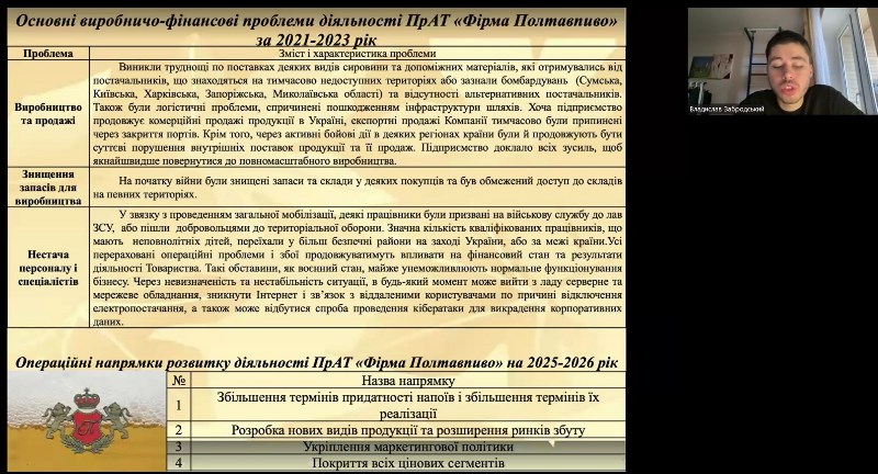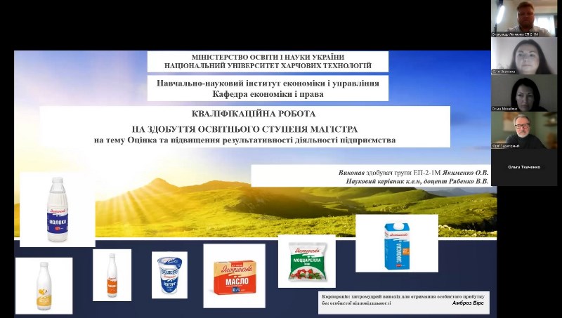 Магістранти денної та заочної форми здобуття освіти представили свої кваліфікаційні роботи екзаменаційній комісії. Цьогоріч комісію очолював Юрій Задріпряний – фахівець і практик з багаторічним досвідом, заступник генерального директора, голова Київського відділення науково-технічного товариства харчової промисловості України, ТОВ «Єврокон Україна», заступник голови оргкомітету IV Міжнародної науково-практичної конференції «Здорове харчування від дитинства до довголіття: комплексний підхід, стан та перспективи». Разом із в.о. завідувача кафедри Юлією Левченко та членами комісії, доцентами кафедри протягом двох засідань із захисту денної та одного захисту заочної форм здобуття освіти заслухали захисти кваліфікаційних робіт здобувачів. Роботи вирішували актуальні теми бізнесу: підвищення ефективності, господарські ризики, попередження банкрутства тощо. Не менш своєчасні до вимог ринку проєкти-пропозиції представили здобувачі, серед яких охоплено наступні напрями: діджиталізація бізнесу, використання сучасних технологій, лізинг, системи керування ресурсами, CRM та EPR системи тощо.