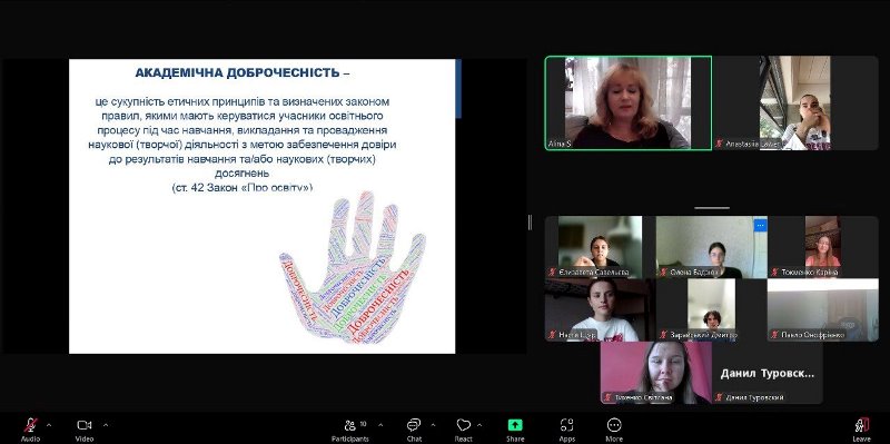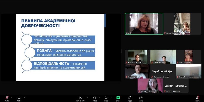 Були розглянуті нормативні документи як на державному, так і на університетському рівні, що регулюють питання академічної етики. А цікава презентація сприяла наочності подання матеріалу.