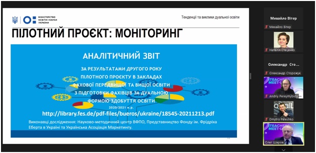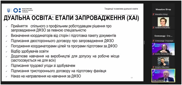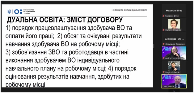 Спікер поділився напрацюваннями щодо етапів запровадження дуальної освіти, формування змісту договорів про дуальну освіту, рекомендаціями щодо розподілу часу у графіку освітнього процесу і тими основними труднощами, які наразі існують при запровадженні дуальної освіти. Також присутні були ознайомлені з основними питаннями Проєкту положення про дуальну освіту.