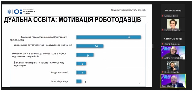 Зокрема, у доповіді були надані відповіді на питання, які наші викладачі задавали під час реєстрації: яким має бути зміст договору про дуальну освіту; як зацікавити роботодавців до участі у дуальній освіті?
