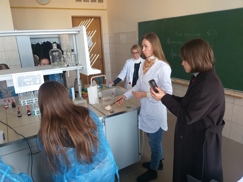 На завершення першого дня технологічних студій їх учасники відвідали урок хімії на тему «Класи неорганічних сполук. Використання неорганічних сполук як харчових добавок», який провели доцентка кафедри харчової хімії Віра Іщенко та старша викладачка кафедри Христина Чабаненко. Учасники власноруч під керівництвом викладачів виконали якісні реакції та переконалися у важливості навчальної дисципліни хімія.