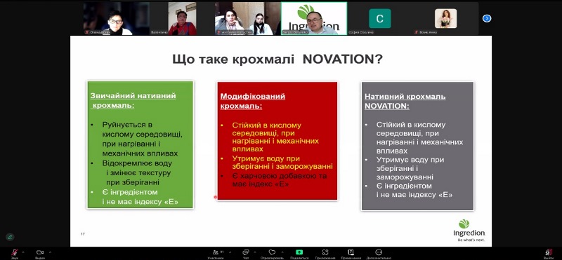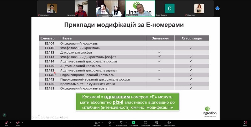 Фахівець детально пояснив хімізм процесів різних видів модифікації крохмалю. Слухачі дізналися про інновації у сфері розроблення крохмалів «Novation», які застосовуються для виробництва продуктів зі «чистою етикеткою», про крохмалі для безводного застосування тощо. Сергій Даценко наводив багато прикладів застосування модифікованого крохмалю у різних галузях харчової промисловості, постійно звертаючи увагу на впливи параметрів технологічного процесу на властивості крохмальних клейстерів.