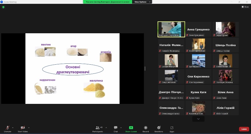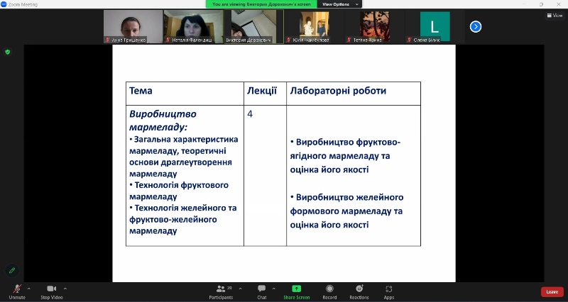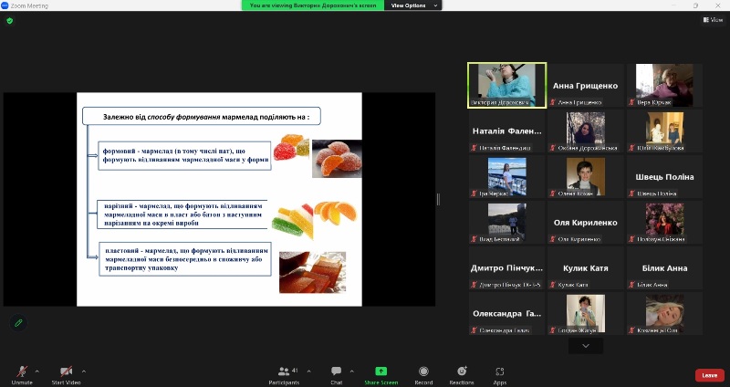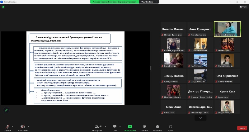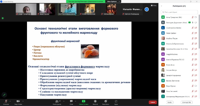 Тема першої лекції була присвячена загальній характеристиці мармеладу та теоретичним основам драглеутворення. Лекторка Вікторія Дорохович детально розглянула асортимент мармеладу, навела принципові схеми виготовлення мармеладу та коротку характеристику технологічних операцій. Багато уваги викладачка приділила процесам драглеутворення у мармеладних масах, залежно від виду драглетуворювача.